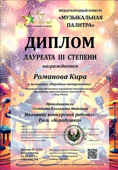 Романова Кира — лауреат III степени в номинации “Народные инструменты” (аккордеон)! Преподаватель: Соловьёва Е. И.
