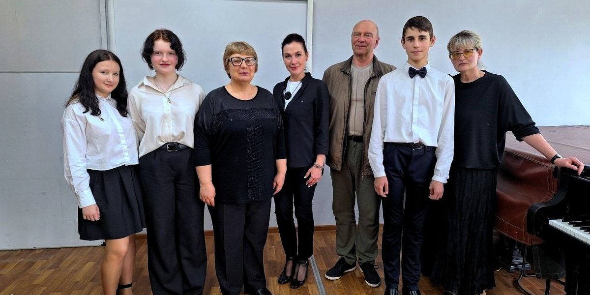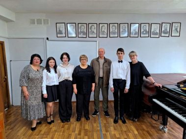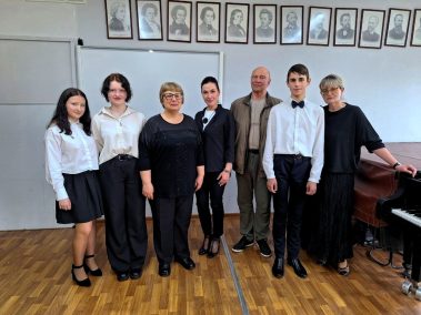 На фото: наши выпускники со своим преподавателем Ларисой Геннадьевной Гераськиной, концертмейстером Ириной Николаевной Шемонаевой, председателем экзаменационной комиссии – преподавателем Тульского колледжа искусств им. А.С.Даргомыжского Александром Юрьевичем Алексеевым, заведующей Музыкальным отделением Еленой Андреевной Борисовой и Директором школы Ларисой Владимировной Старостиной.