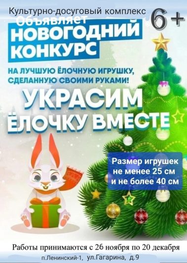 КУЛЬТУРНО-ДОСУГОВЫЙ КОМПЛЕКС приглашает всех желающих принять участие в новогоднем конкурсе “Украсим ёлочку вместе”.