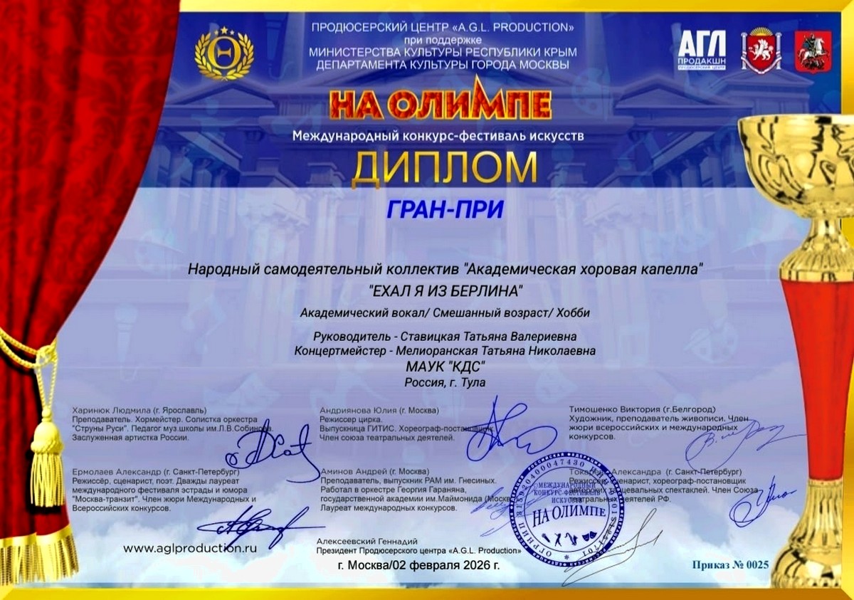 Коллектив “Академическая хоровая капелла” вновь подтвердил своё превосходство, завоевав высший титул конкурса — ДИПЛОМ ГРАН-ПРИ Международного конкурса-фестиваля искусств “На Олимпе”.