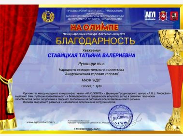 Особое внимание заслуживает вклад в развитие коллектива Директора Культурно – досуговой системы Лёвиной Марины Александровны, руководителя коллектива — Ставицкой Татьяны Валериевны и концертмейстера Мелиоранской Татьяны Николаевны.