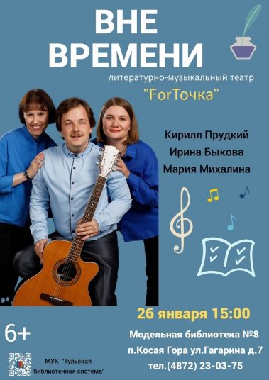 Концертная программа “Вне времени” о том, что здесь и сейчас, и о том, что всегда актуально. Авторы программы представят свои произведения, а также исполнят стихи и песни классиков, не утративших актуальности.