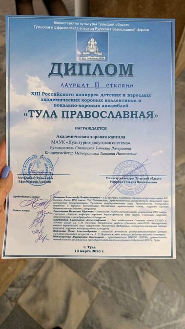 Участие в конкурсе принесли высокие результаты: диплом 1 степени в двух номинациях – Вокал “Великая победа”, Хоровой вокал. А так же хор “Академическая капелла” принял участие в XIII Российском конкурсе детских и взрослых академических хоровых коллективов и вокально-хоровых ансамблей “Тула православная”, где стали Лауреатами 3 степени!