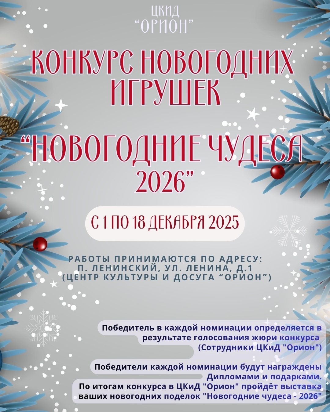 По итогам конкурса в Центре культуры и досуга “ОРИОН” пройдёт выставка Ваших новогодних поделок “Новогодние чудеса – 2026”