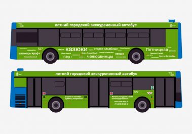 Кстати, теперь наш автобус будет легко узнать: по мягкому зелёному фону и ключевым словам экскурсии – автор дизайна Алексей Домбровский.