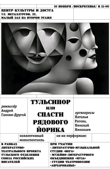Литературное мероприятие – уникальный “коллективный моноспектакль” “Тульсинор или спасти рядового Йорика” с участием авторов творческих объединений города и членов союза российских писателей.