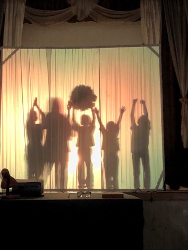 Так же для представлений театра теней мы использовали большой полупрозрачный экран из ткани, подсвечиваемый сзади. Каждый из присутствовавших в зале смог попробовать свои силы в постановке движущейся и статичной фигуры.