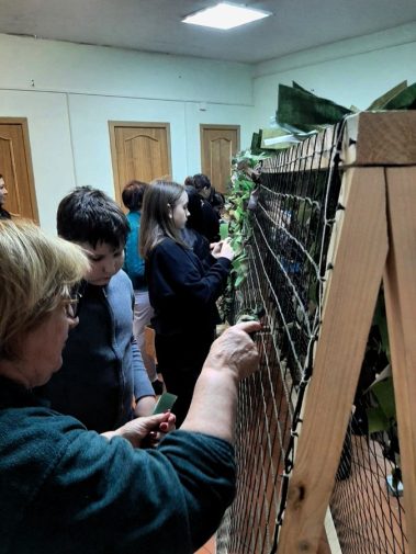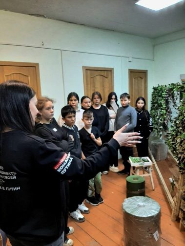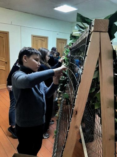 Ребята, пятиклассники, с интересом познакомились с историей акции “Белые журавли Памяти” и показали женщинам-волонтерам свое умение плести маскировочные сети, которым они овладели на занятии.