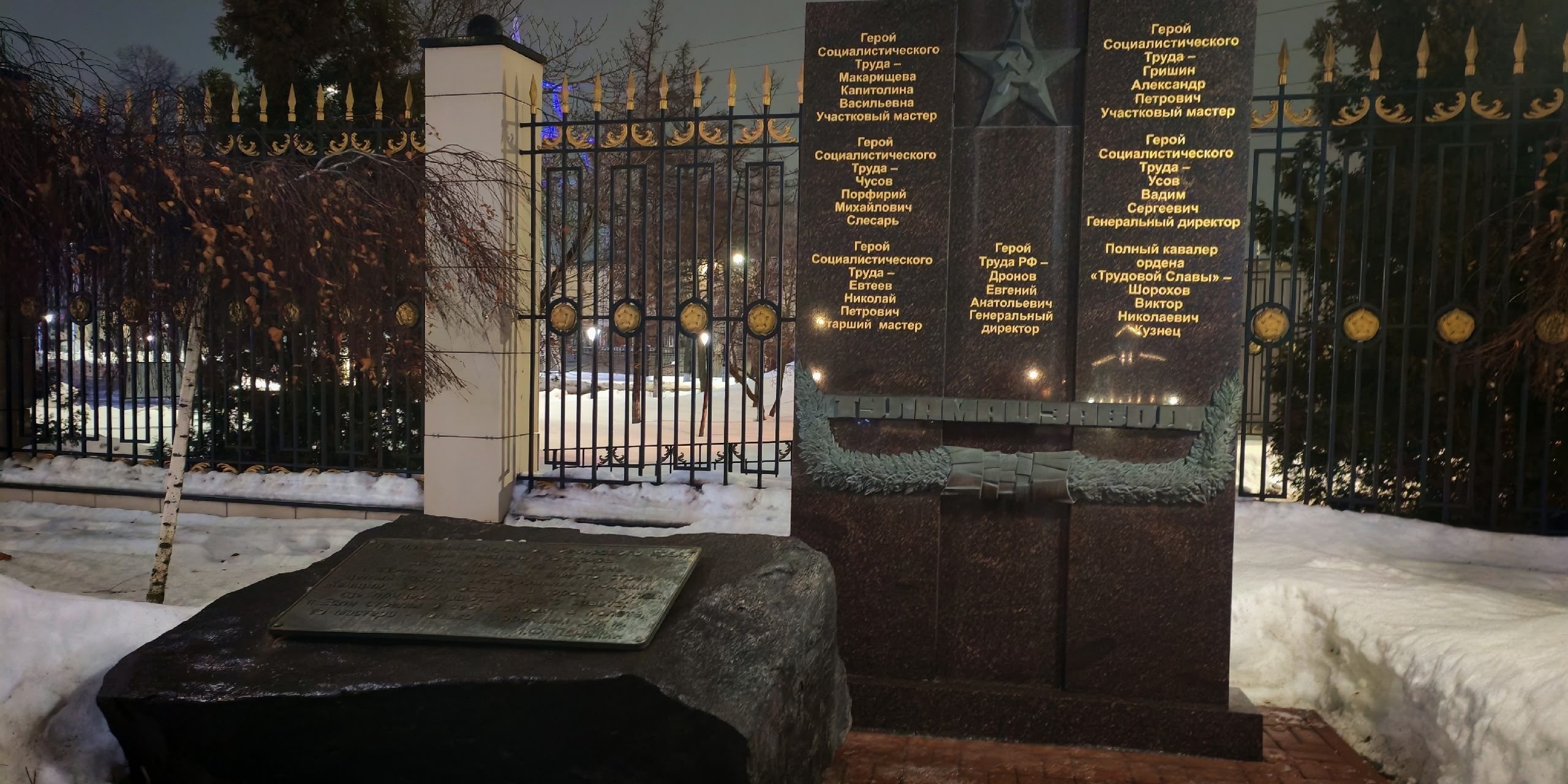 Памятный знак “Подвиг ратный, подвиг трудовой” установлен у главного въезда на территорию завода, перед Свято‑Владимирским храмом. Его расположение символизирует единство воинского и трудового подвига, подчёркивая взаимосвязь фронта и оборонной промышленности. Композиционное решение памятника отражает идею единства двух форм служения стране, военной и производственной. Он служит архитектурной доминантой входной зоны и задаёт мемориальный характер всему пространству предприятия.