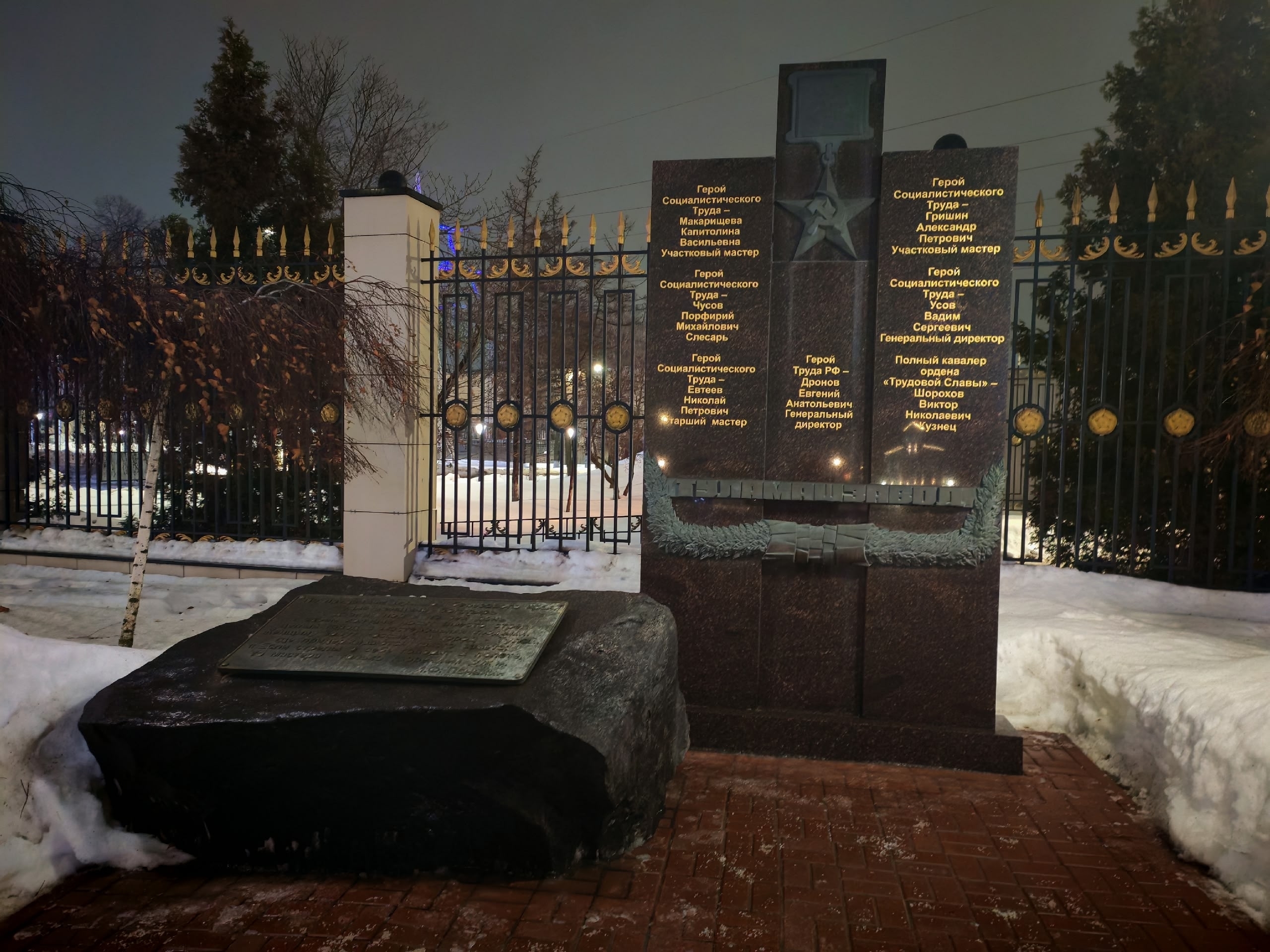 Памятный знак “Подвиг ратный, подвиг трудовой” установлен у главного въезда на территорию завода, перед Свято‑Владимирским храмом. Его расположение символизирует единство воинского и трудового подвига, подчёркивая взаимосвязь фронта и оборонной промышленности. Композиционное решение памятника отражает идею единства двух форм служения стране, военной и производственной. Он служит архитектурной доминантой входной зоны и задаёт мемориальный характер всему пространству предприятия.