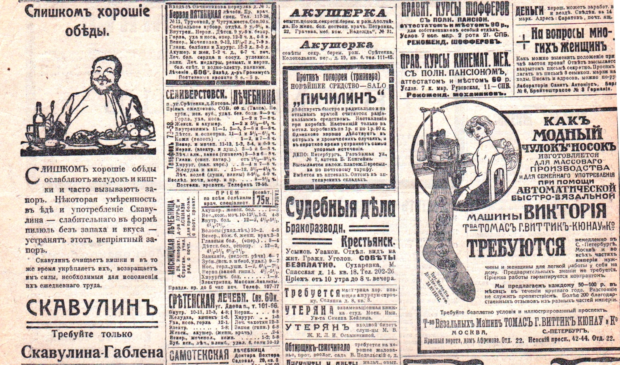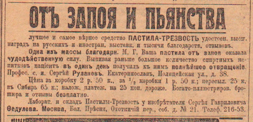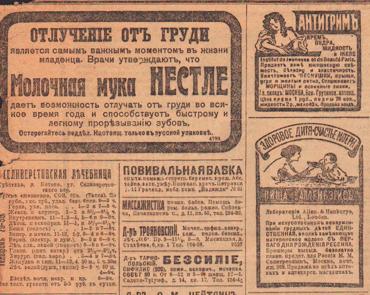 При этом часто встречались рекламы чудодейственных средств, достойные изворотливой фантазии героев О. Генри. Страждущим предлагали бальзамы от облысения, таблетки для мгновенного похудения, пастилки, спасающие от алкоголизма (иллюстрация №3 – что характерно, с «позитивным кейсом» излечившегося), средства, способные увеличить женский бюст или избавить от лишних волос на теле. Среди продуктов питания на страницах журналов особенно часто мелькали диетические препараты доктора Ламанна, американская овсянка “Геркулес” в коробках и – внимание! – молочная мука “Нестле” или мясной бульон “Магги” в кубиках.