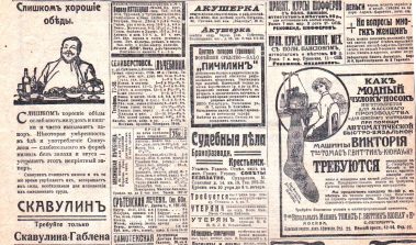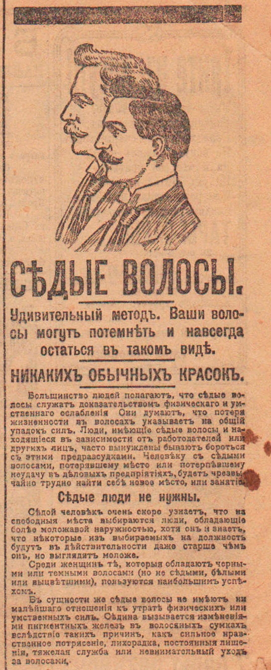 Подобные печатные “выкрики” мы видим и на страницах газет из фондов ТИАМа. Например, в газете “Трудовая копейка” от 26 августа 1912 года отдельную колонку занимает объявление чудо-средства от седины и облысения (иллюстрация №6). Что это за средство – тайна тайн. Некая лаборатория Кальтоко обещала “исключительную, чрезвычайно интересную книгу о том, как улучшить и сохранить волосы, совершенно даром”! Нужно всего лишь приложить две марки по 7 копеек за пересылку.