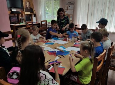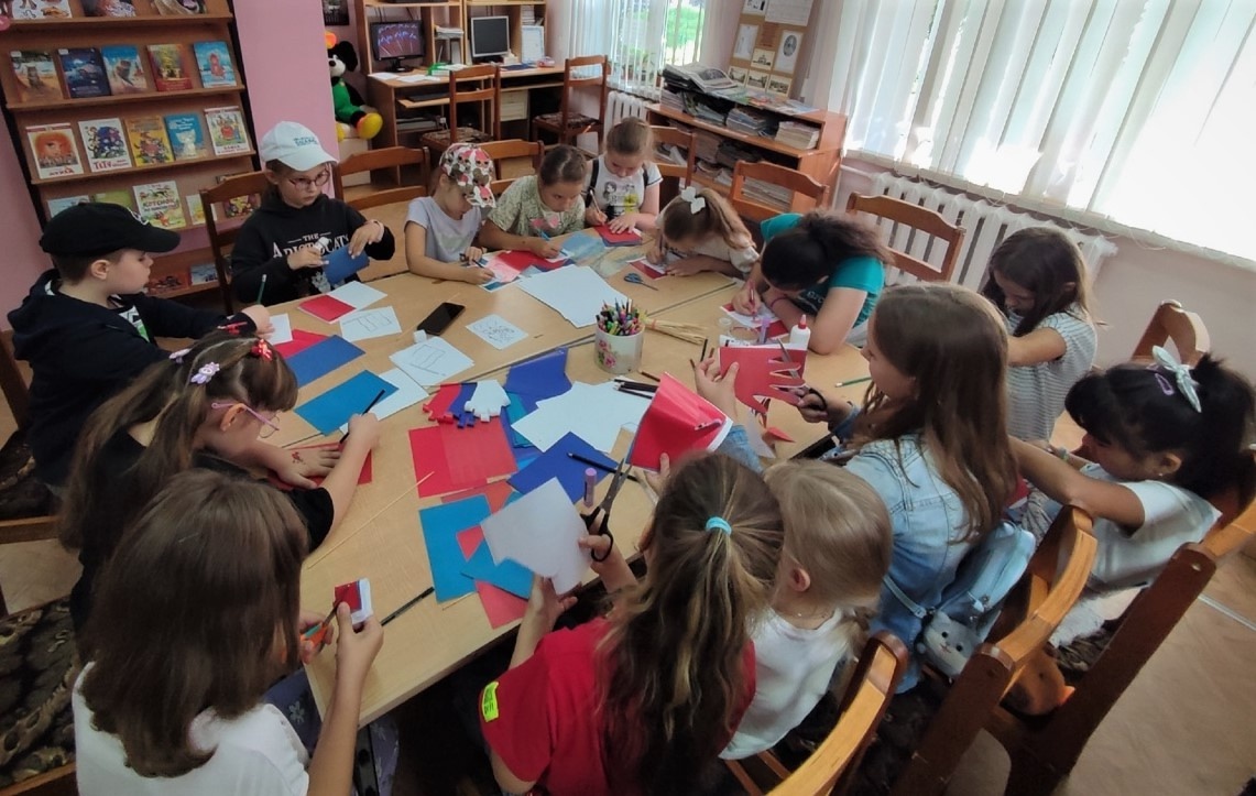 Сегодня на творческую мозаику “Бело-сине-красный стяг – это наш российский флаг”для украшения библиотечного окошка были приглашены наши юные читатели.