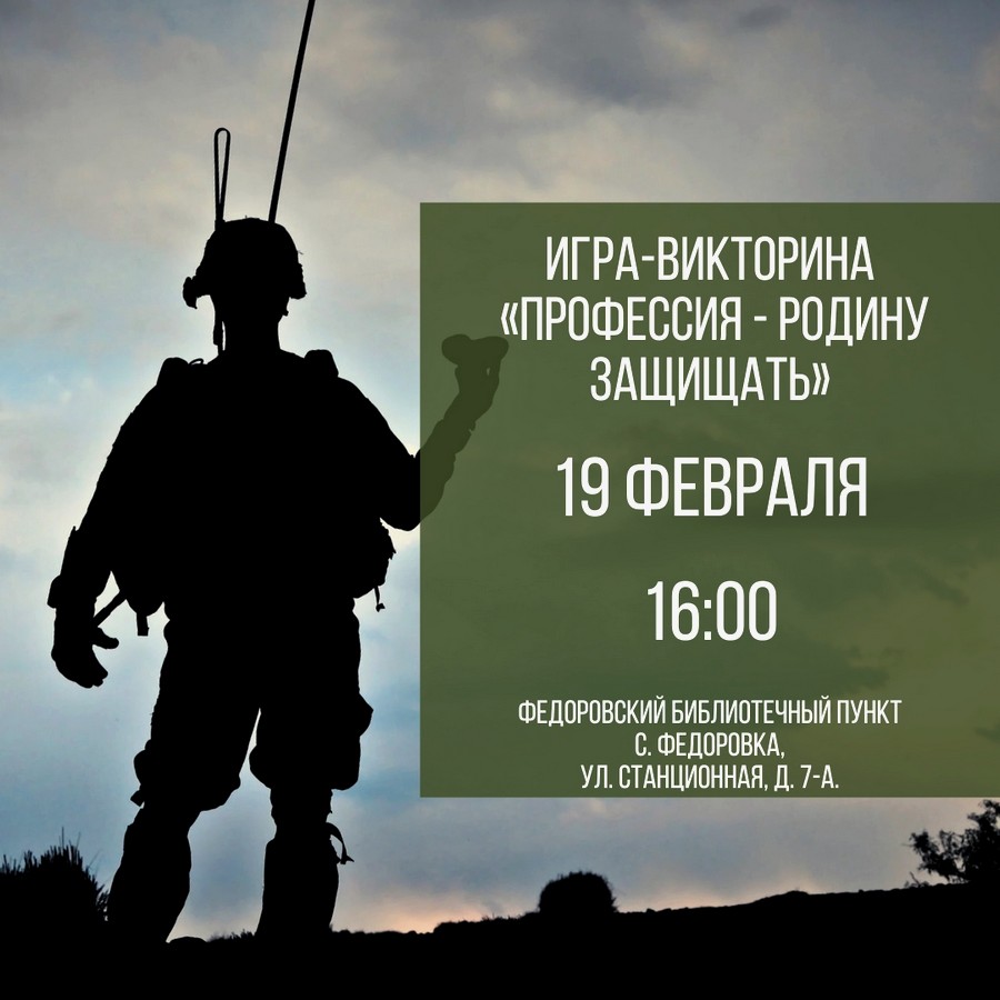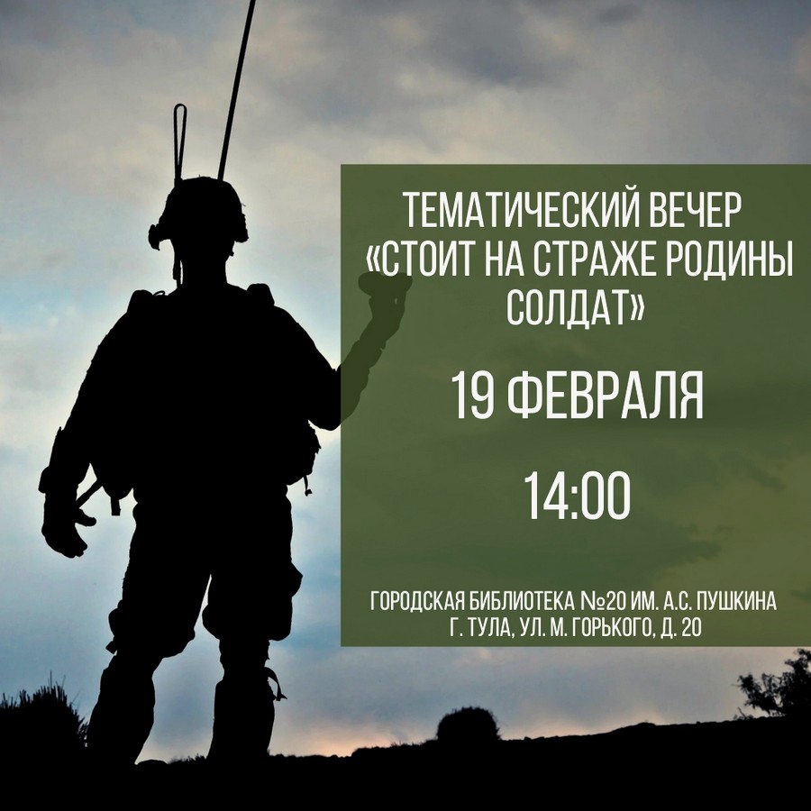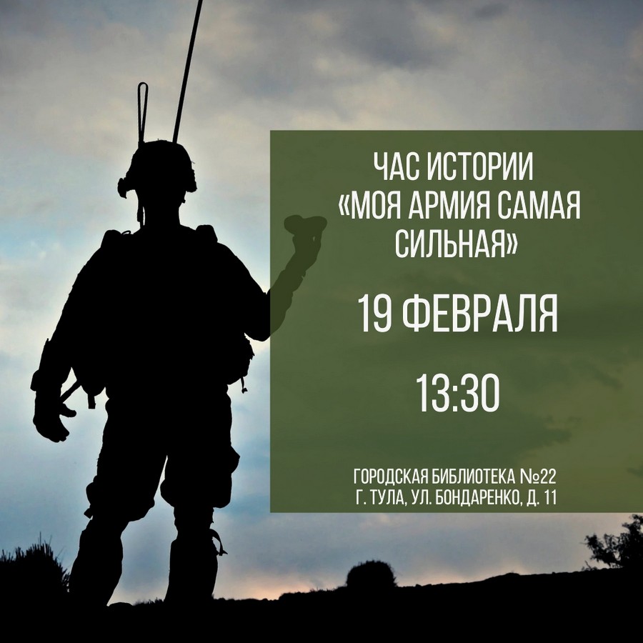 В преддверии Дня защитника Отечества наши библиотеки подготовили для вас цикл увлекательных встреч. Есть даты, которые объединяют поколения. День защитника Отечества — праздник мужества, силы духа и верности Родине. Тульская библиотечная система приглашает детей и взрослых окунуться в историю, проверить свои знания и просто хорошо провести время на наших мероприятиях.