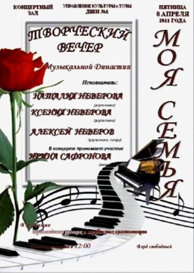 В 2008 году, в Год Семьи, семья Неверовых приняла участие в первом городском конкурсе “Мама, папа, я – музыкальная семья”. Все семьи-участники конкурса получили ценные подарки, а семья Неверовых получила звание “Самой артистичной”. Представление своей семьи в стихах Наталия сочиняла сама. Помимо игры на фортепиано, Алексей обучался игре на гитаре в классе преподавателя Галины Владимировны Гладышевой. И когда Наталия задумала воплотить свою мечту – подготовить творческий вечер семьи Неверовых, было понятно, что в программу концерта войдут различные жанры и формы игры на различных музыкальных инструментах. Всё, от создания сценария, как всегда, в стихах, подбора видеоряда к каждому номеру, подбор музыкальных номеров…это творческое воплощение мечты Наталии Неверовой. В концерте она и её дети выступали в разных формах музицирования: сольное выступление, выступление в качестве концертмейстера, игра в ансамбле, как фортепианном, так и камерном – гитара с фортепиано, гитара со скрипкой. Каждый номер сопровождался возгласами «Браво»! В своём отзыве на творческий вечер семьи Неверовых зав.фортепианным отделением Тульского колледжа искусств им.А.С.Даргомыжского Любовь Залмановна Левинсон отмечала: “Творческий вечер музыкальной династии Неверовых имеет очень большое воспитательное значение. Для того, чтобы в семье возникло взаимопонимание, очень важно, чтобы родители и дети были объединены общими интересами и общим делом…”.
