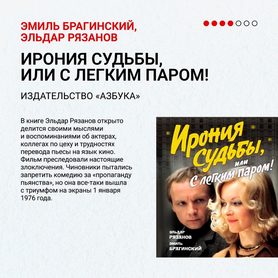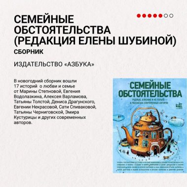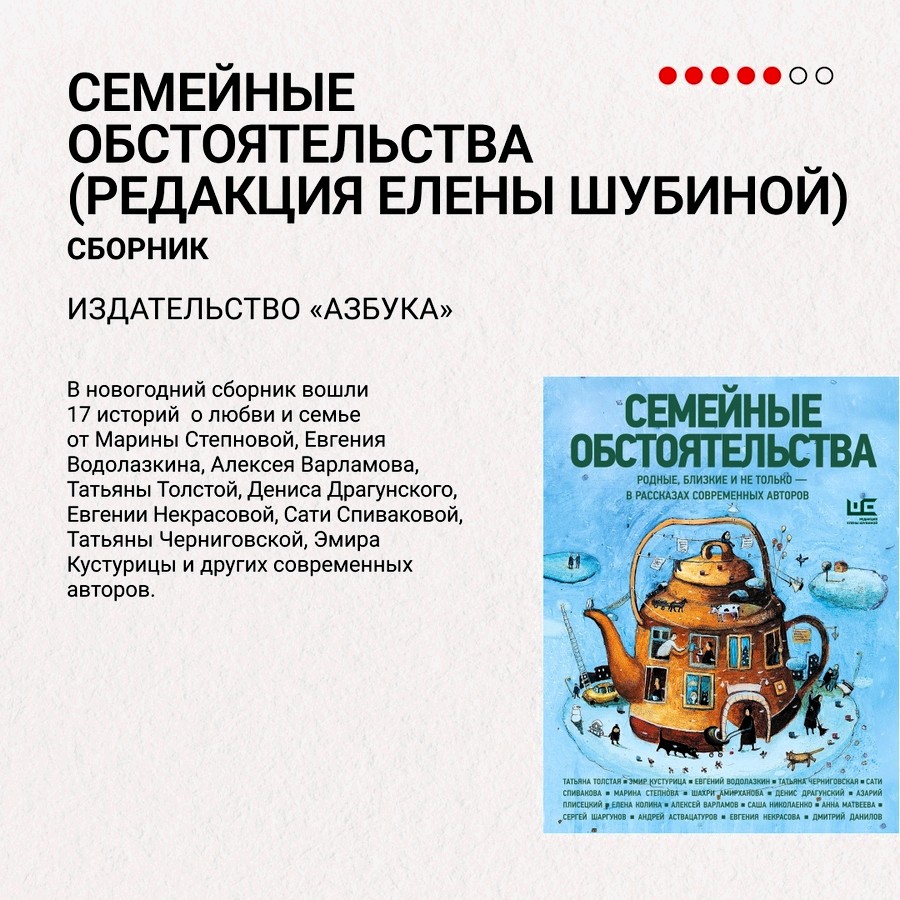 Среди изданий — книга, в которой Эльдар Рязанов открыто делится своими мыслями и воспоминаниями об актерах, коллегах по цеху и трудностях “перевода” пьес на язык кино. Представлен также новогодний сборник, включающий 17 историй о любви и семье от Марины Степновой, Евгения Водолазкина, Алексея Варламова, Татьяны Толстой, Дениса Драгунского, Евгении Некрасовой, Сати Спиваковой, Татьяны Черниговской, Эмира Кустурицы и других современных авторов.