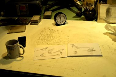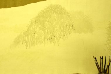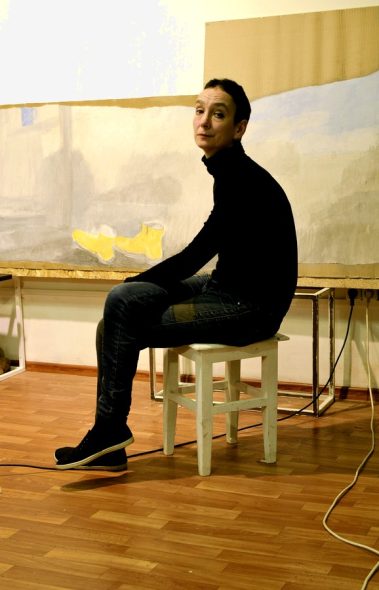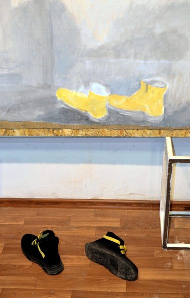 Интересно, что Анастасия уже размечает пространство Дома Крафта под инсталляцию, которая весной появится в здешнем фойе. Откроем и другой секрет: на выставке в одном из залов будет представлен “бесконечный” пейзаж. Его-то и пишет художник буквально здесь и сейчас.