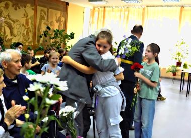 Всем присутствующим в зале выпала большая честь и уникальная возможность познакомиться со столетним юбиляром – Василием Марковичем Мирошниченко. Василий Маркович рассказал детям о своем военном прошлом, пожелал им отличной учебы и быть достойными памяти своих дедов и прадедов.