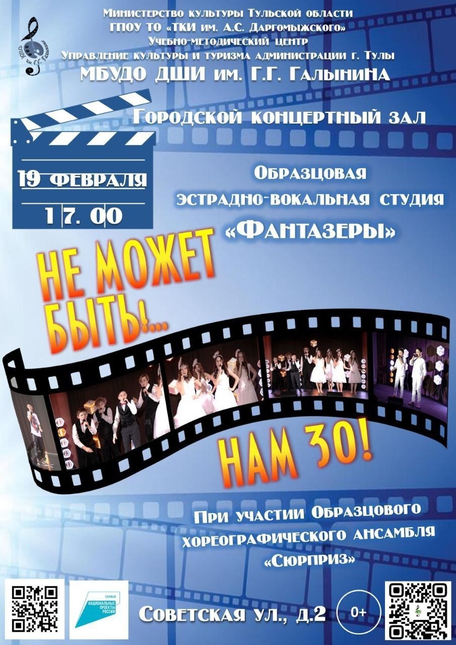 Приглашаем Вас посетить Юбилейный концерт “НЕ МОЖЕТ БЫТЬ… НАМ 30!” Образцовой эстрадно-вокальной студии “Фантазеры” (руководитель Балакирева И. Б.). При участи Образцового хореографического ансамбля “Сюрприз” (руководитель Катогарова Л.Н.)