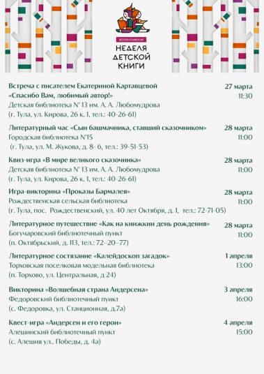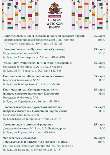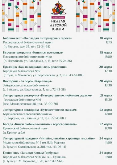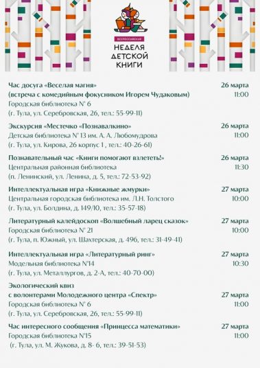 Дорогие друзья! В этом году ежегодная Всероссийская акция Неделя детской книги в библиотеках Тульской библиотечной системы пройдет с 18 марта по 4 апреля!
