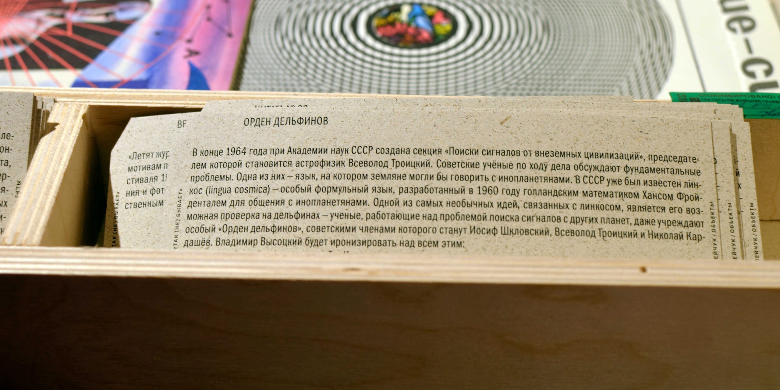 Одним из объектов выставки “Так (не) бывает. Вячеслав Колейчук. Объекты” является картотека событий и процессов, происходивших в 60-80-е гг. XX века как в Советской России, так и во всём мире. Короткие заметки на серых канцелярских карточках погружают нас в исторический и культурный контекст эпохи, в которой научно-технический прогресс стал настоящим культом. Учёные и писатели-фантасты наступали друг другу на пятки в своих научных и творческих изысканиях, а обыватель, только что привыкший к телевизору, почувствовал, что пора готовиться к космическим командировкам, которые уже вот-вот случатся.
