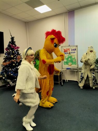 Какой же Новый год без Деда Мороза и Снегурочки? А без вредной Кикиморы? Вместе с ними ребята сначала разделились на две команды и с удовольствием под музыку участвовали в игре “Рукавичка”: у кого оказалась варежка Деда Мороза, тот и исполнял желание Снегурочки.