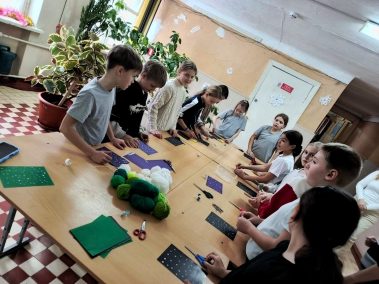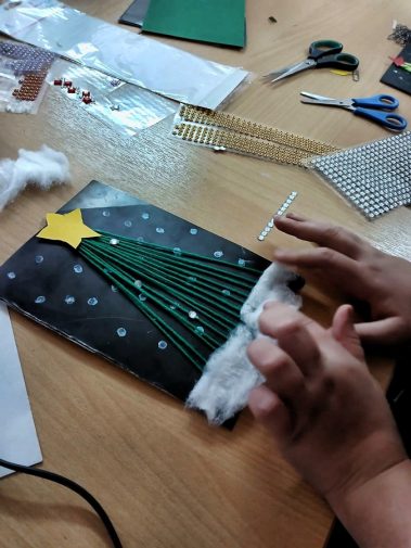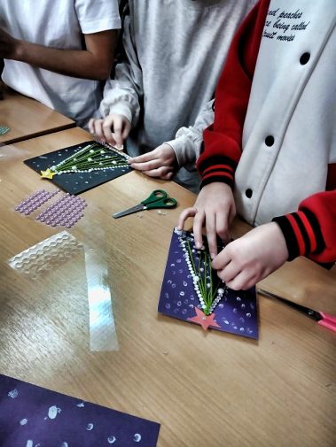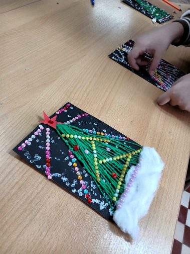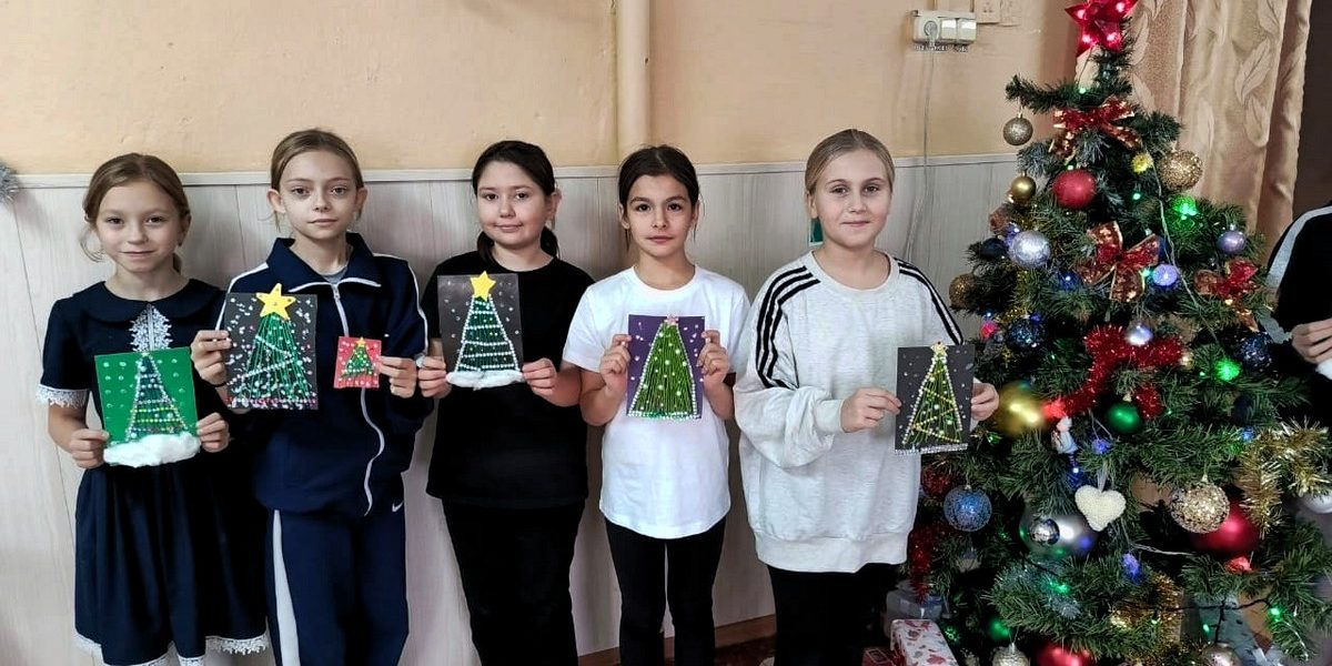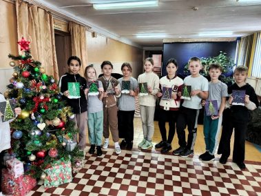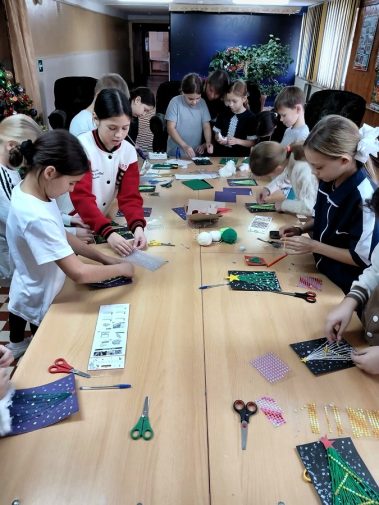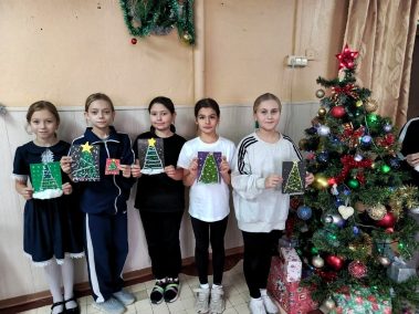 Мальчишки и девчонки с помощью ниток, картона, ватных палочек, страз и бусин создали прекрасную новогоднюю ёлку которую смогут вручить своим близким