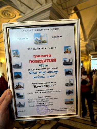 11 января ансамбль русской песни “Вдохновение” Детской школы искусств № 6 стал победителем VII Рождественского фестиваля, организованного Тульской Епархией “Пою Богу моему дондеже есмь”.