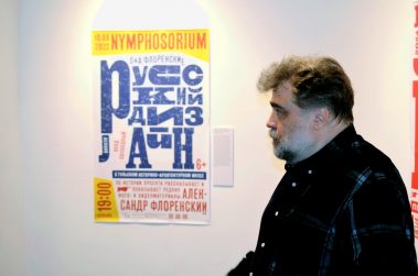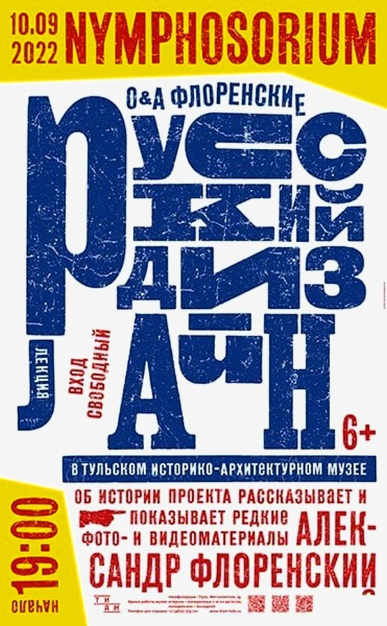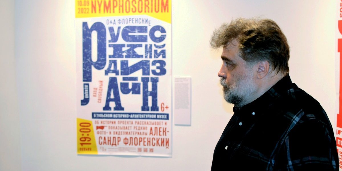 Комментарии к каждой афише (их можно прочесть на выставке) написал сам Алексей. Сегодня публикуем его текст о плакате к лекции “Русский дизайн”, прошедшей в 2022 году в Нимфозориуме:
