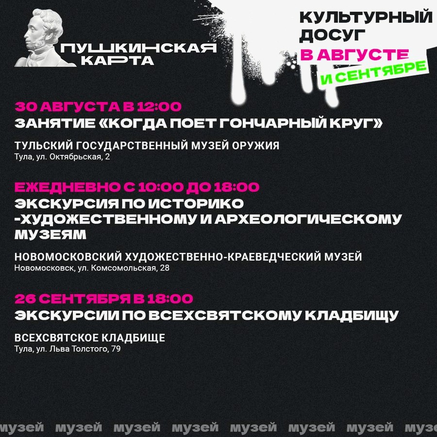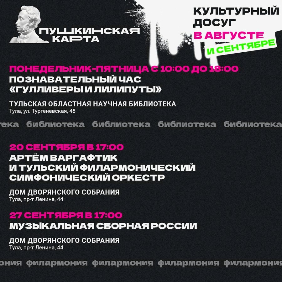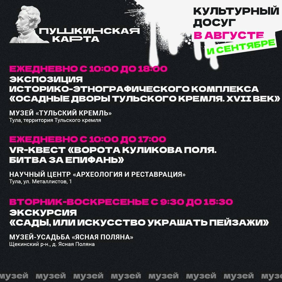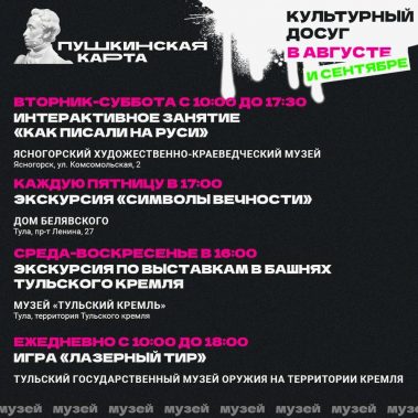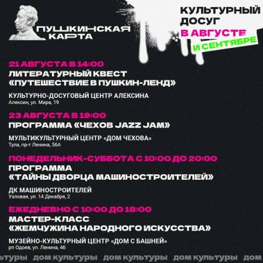 В Тульской области вас ждет множество классных событий. Смотрите нашу афишу, выбирайте, куда пойти, зовите друзей и проводите время с пользой и удовольствием.