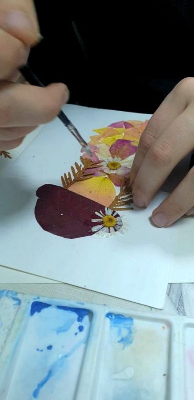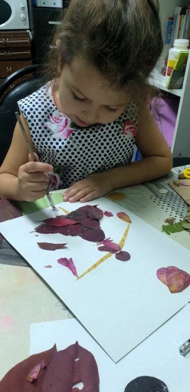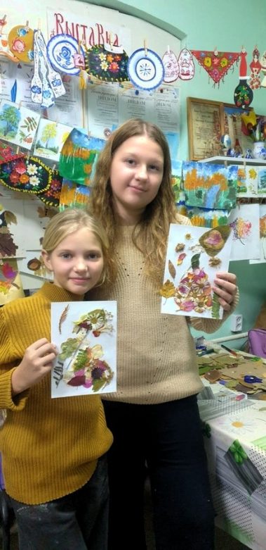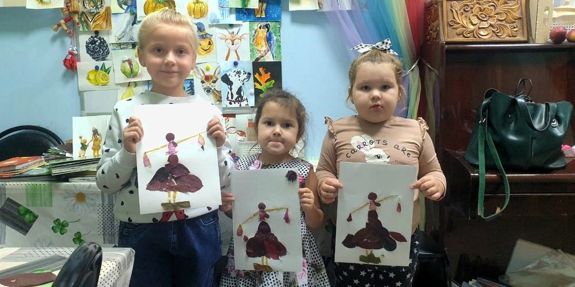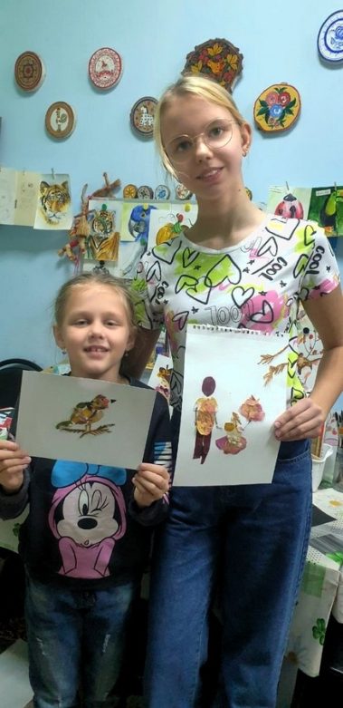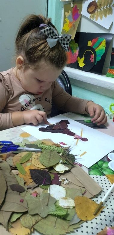 Участники младшей и средней группы клубного формирования “Капитошка” Центра творчества “МИХАЛКОВСКИЙ” мастерят картины из осенних листьев под руководством Евгении Токмаковой