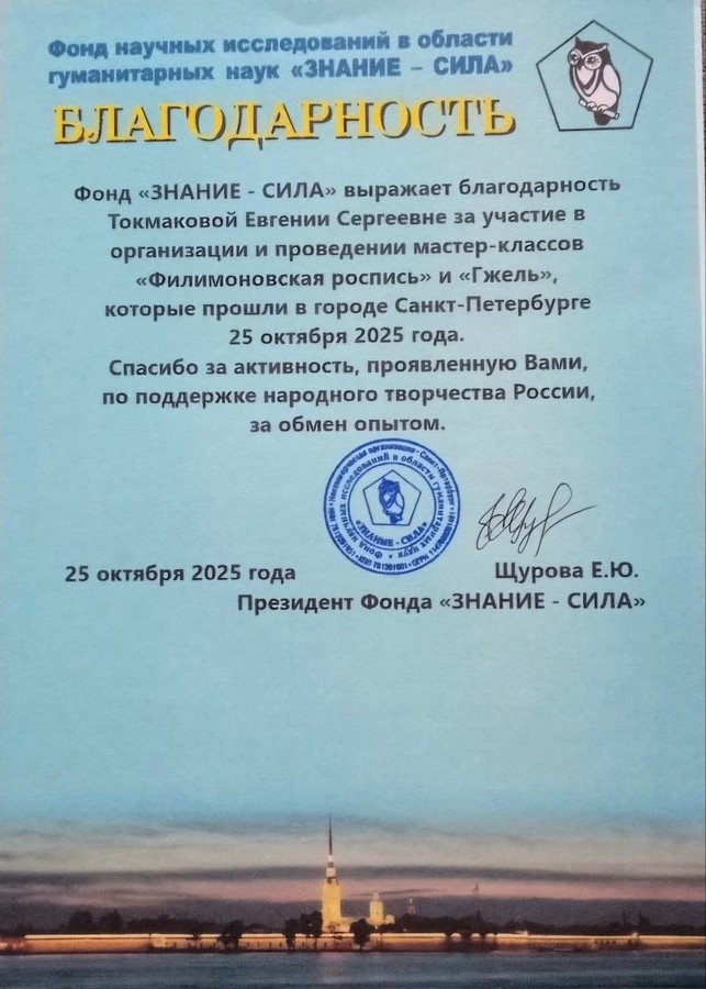 Евгения Сергеевна была награждена благодарностью за активность по поддержке народного промысла России и обмен опытом от Фонда “Знание-Сила” г. Санкт-Петербург, а так же получила массу положительных эмоций и опыт в проведении мастер-класса такого уровня!