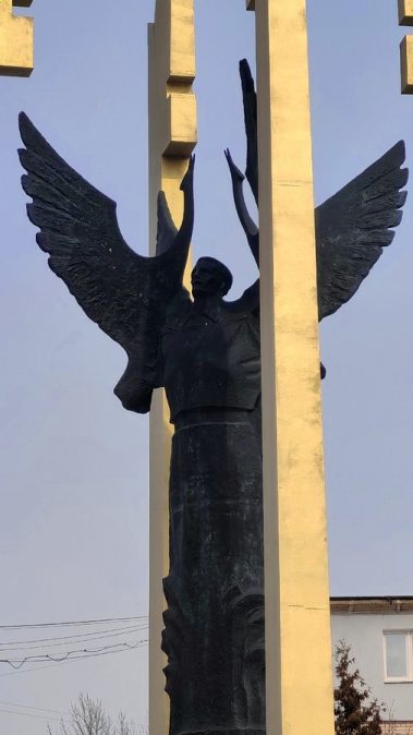 Птицы, улетающие ввысь – души павших воинов. Издалека композиция напоминает ангела с распростёртыми крыльями.