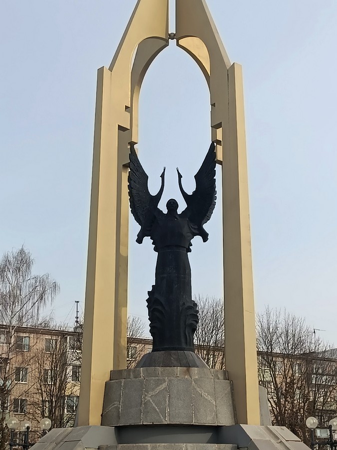 Птицы, улетающие ввысь – души павших воинов. Издалека композиция напоминает ангела с распростёртыми крыльями.