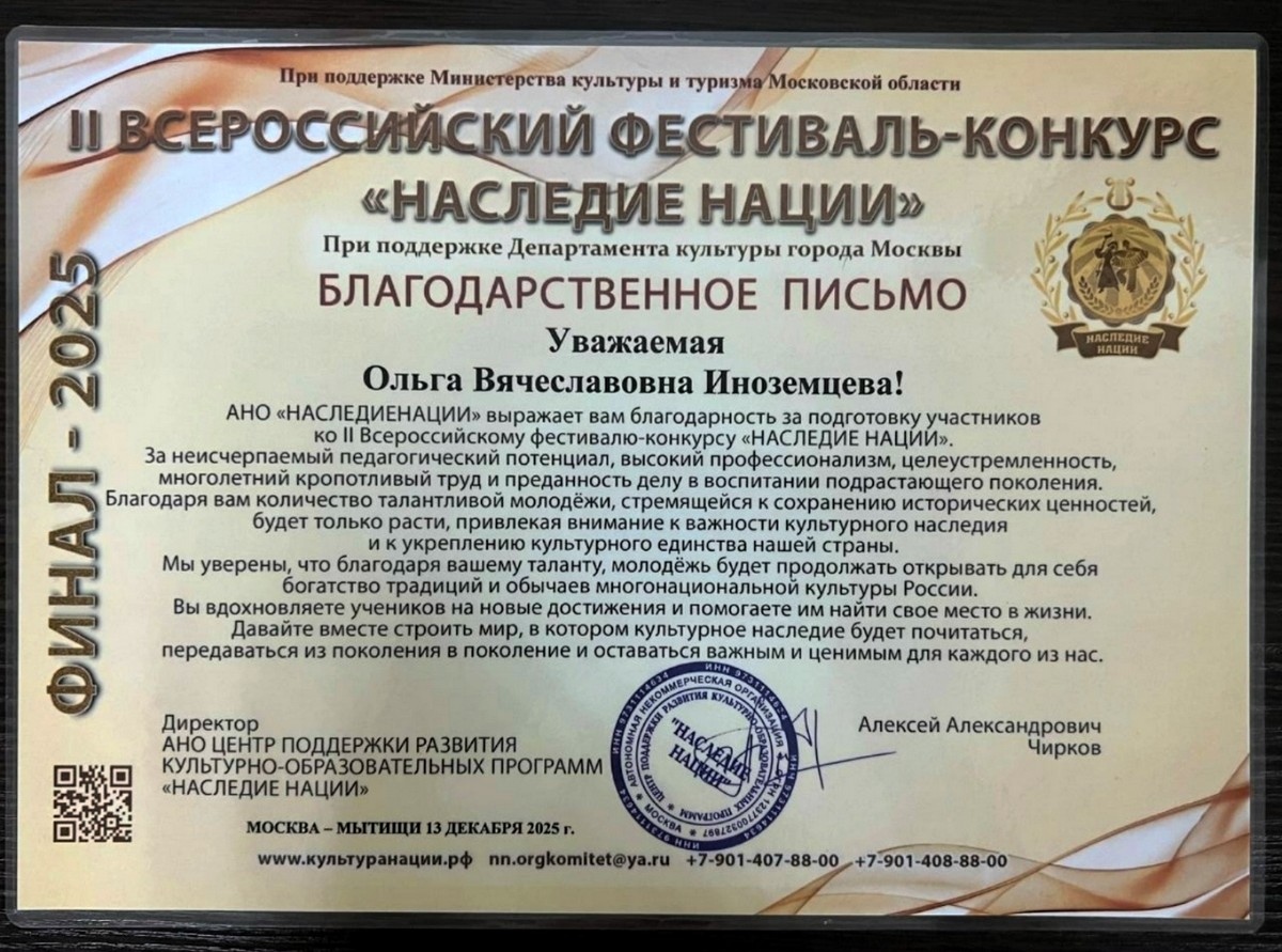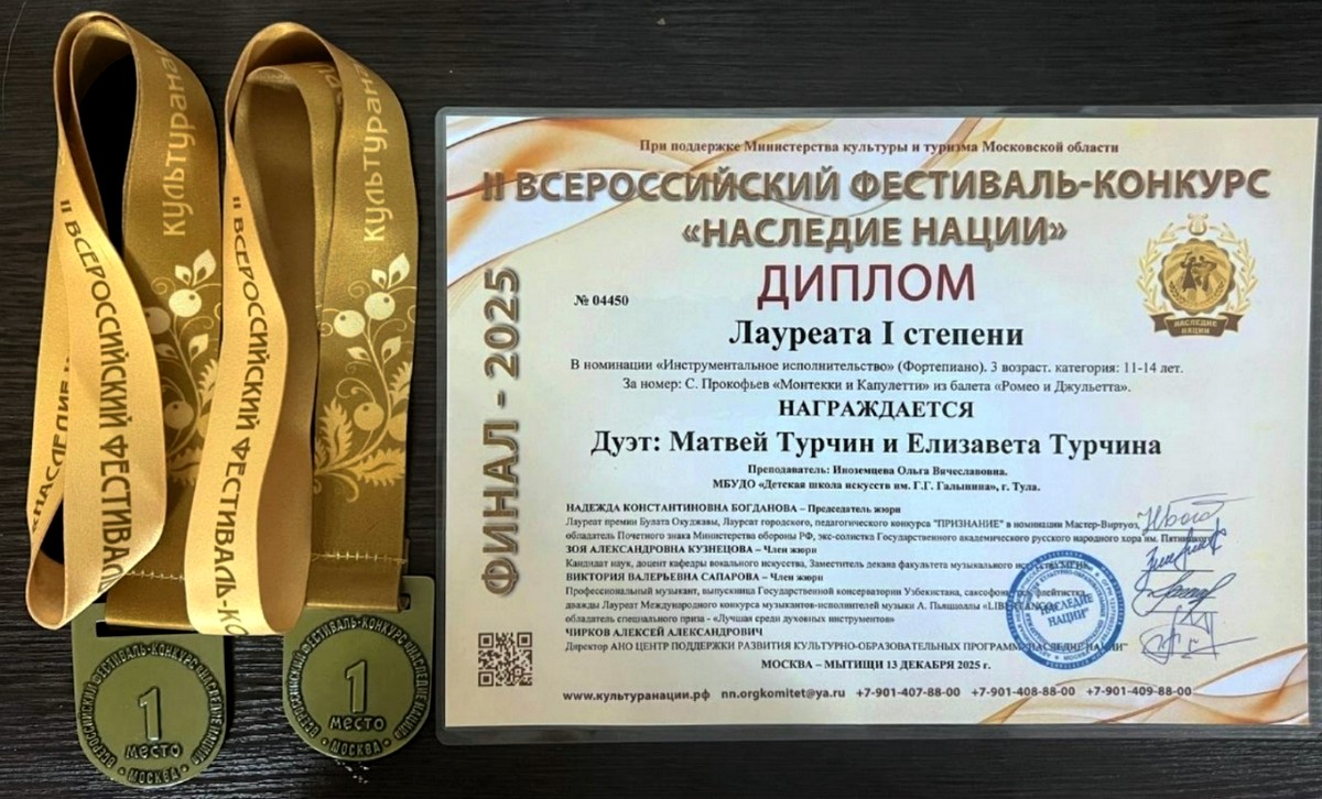Поздравляем фортепианный дуэт Турчин Матвей и Турчина Елизавета Детской школы искусств имени Г.Г. Галынина с получением ДВУХ ДИПЛОМОВ ЛАУРЕАТ I СТЕПЕНИ во II Всероссийском фестивале-конкурсе “Наследие нации”, который проходил 13 декабря 2025 года в г. Москва