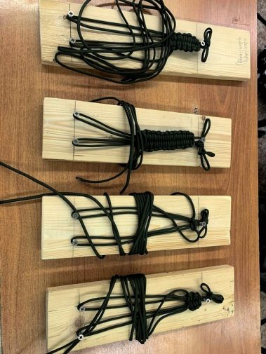 Браслеты из паракорда. Примерно 5 метров сплетено в браслет, по мере необходимости, дёргается за определённый конец верёвки, и она готова по всей длине: легкий и надежный трос.