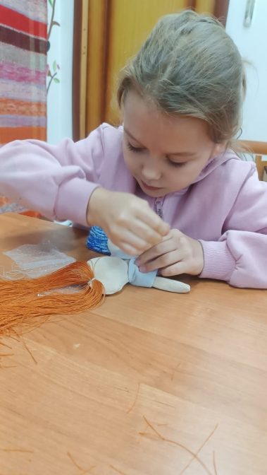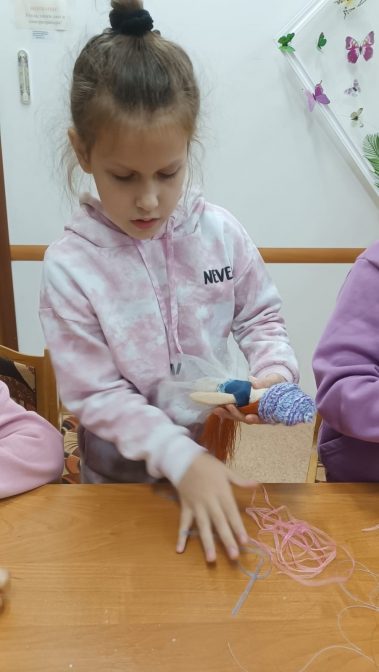 Вначале необходимо придумать стильный образ для куклы. Девчонки комбинировали ткани, подбирали самые разные элементы и аксессуары для создания одежды, а потом приступили к прическам. Ну и последний штрих в образе – шляпки, их нам связала Елена Анатольевна Степанова