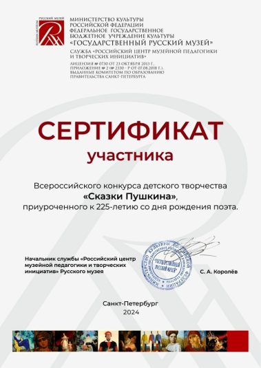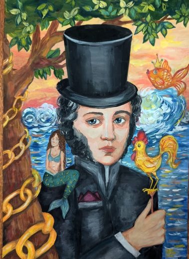Поздравляем Китоян Марине, преподаватель Жигальцова С П, 13 лет Детской школы искусств № 5 “А. С. Пушкин и персонажи его сказок” (Гуашь, масляная пастель) Участник Всероссийского конкурса детского творчества “Сказки Пушкина”, приуроченного к 225-летию со дня рождения поэта.