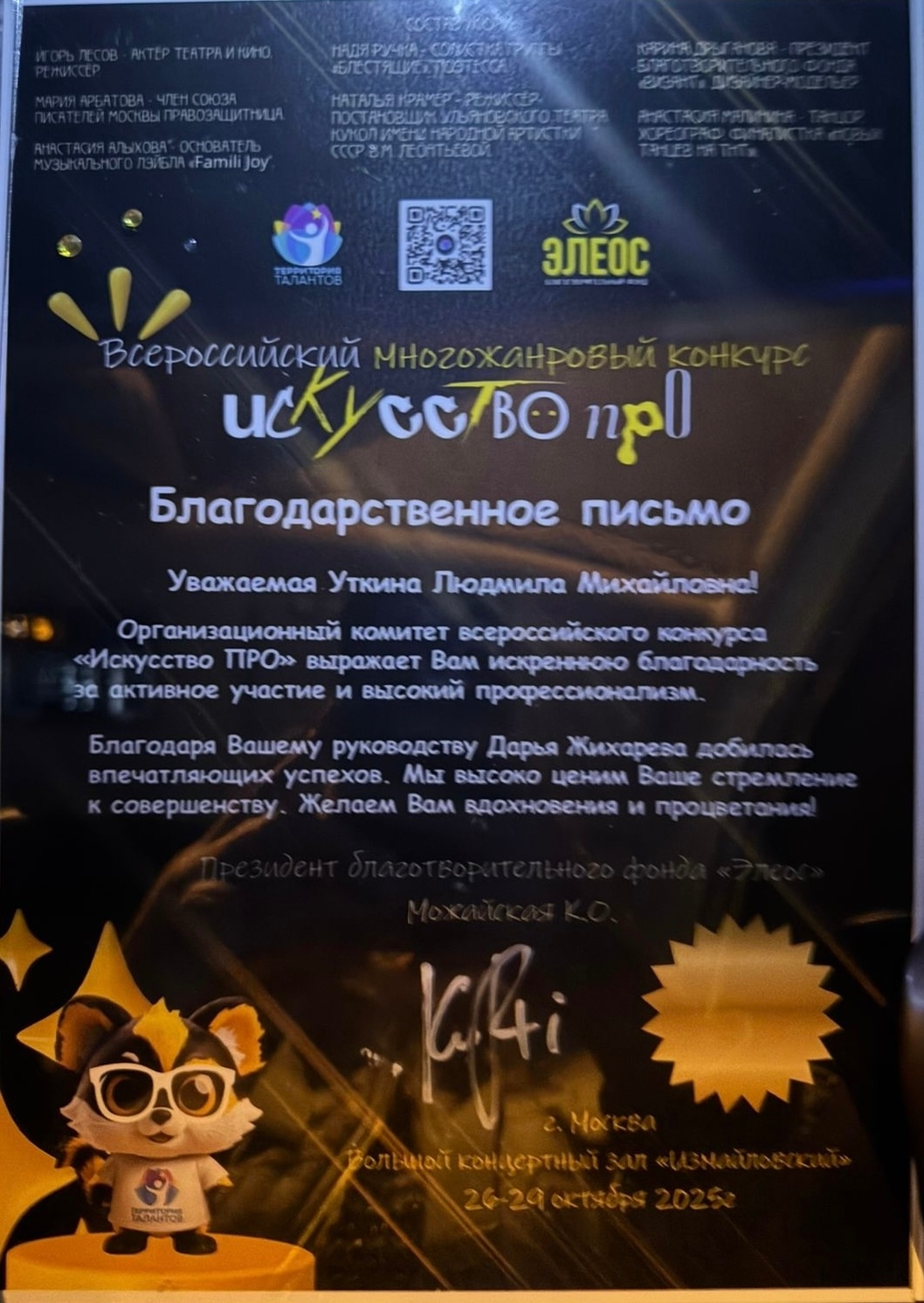 Мероприятие прошло 28 октября в Москве, и Дарья блестяще выступила в номинации “Вокал (соло)”. Её номер покорил жюри и зрителей: он был признан самым ярким и впечатляющим!