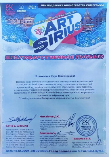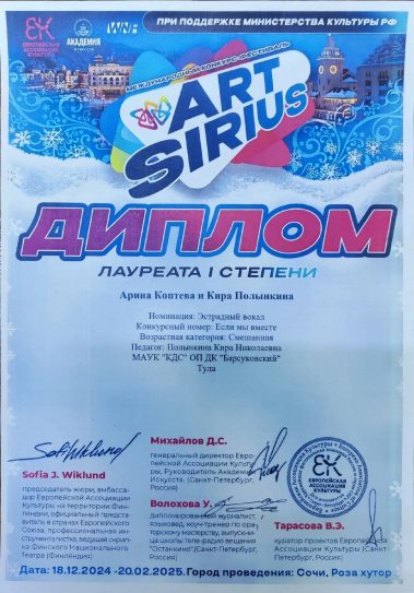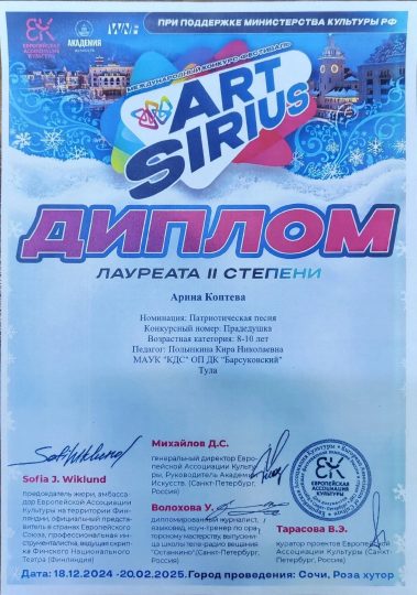 Воспитанники Дома Культуры “БАРСУКОВСКИЙ” приняли участие в Международном конкурсе-фестивале “ArtSirius” и были награждены Дипломами:
