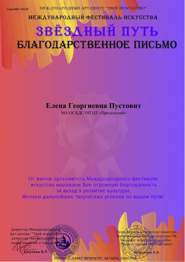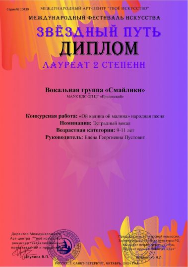 Участники вокального коллектива “Орфей” Центра творчества “Прилепский” были удостоены звания Лауреата II степени Международного фестиваля искусств “Звёздный путь” в номинации Эстрадный вокал.