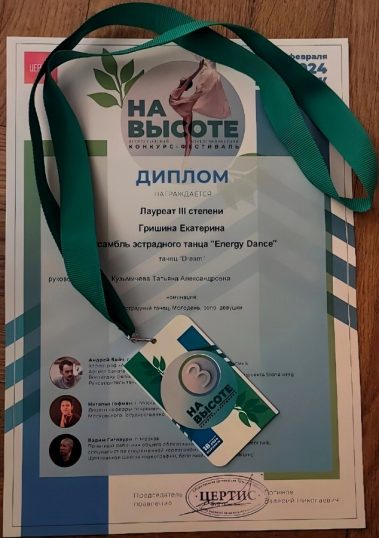 В этот раз в городе Воронеже на Всероссийском хореографическом конкурсе-фестивале “На высоте” наша солистка Гришина Екатерина стала Лауреатом III степени
