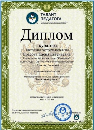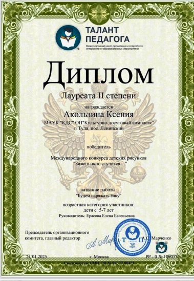 Участница детской студии “Карандаши” (КУЛЬТУРНО-ДОСУГОВЫЙ КОМПЛЕКС) – Ксения Акользина, приняла участие в Международном конкурсе детского рисунка “Зима в окно стучится…” и была награждена Дипломом Лауреата II степени.