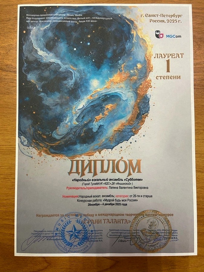 Народный вокальный ансамбль “СУББОТЕЯ” Дома культуры “ИНШИНСКИЙ” был награждён дипломом Лауреата 1 степени за достойную победу в международном творческом кастинг-конкурсе “ГРАНИ ТАЛАНТА”.