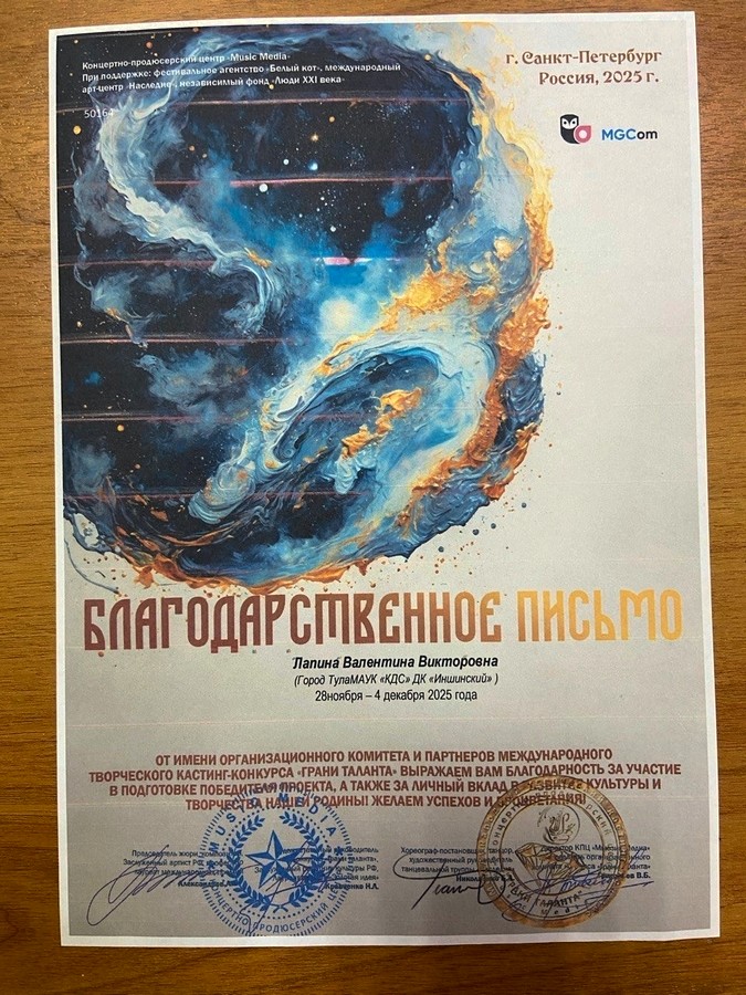 Особое признание заслуживает руководитель ансамбля Валентина Викторовна Лапина, которая была отмечена благодарственным письмом за активное участие в подготовке коллектива и значительный вклад в развитие культуры и творчества нашей РОДИНЫ. Её профессионализм и преданность делу вдохновляют не только участников ансамбля, но и всех, кто ценит искусство.
