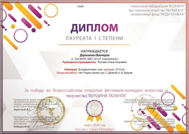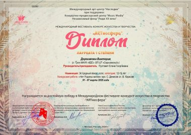 Виктория Дороганова стала Лауреатом I степени на Всероссийском открытом фестивале-конкурсе искусства и творчества “Вершина таланта” и на Международном фестивале-конкурсе искусства и творчества “ARTмосфера”.