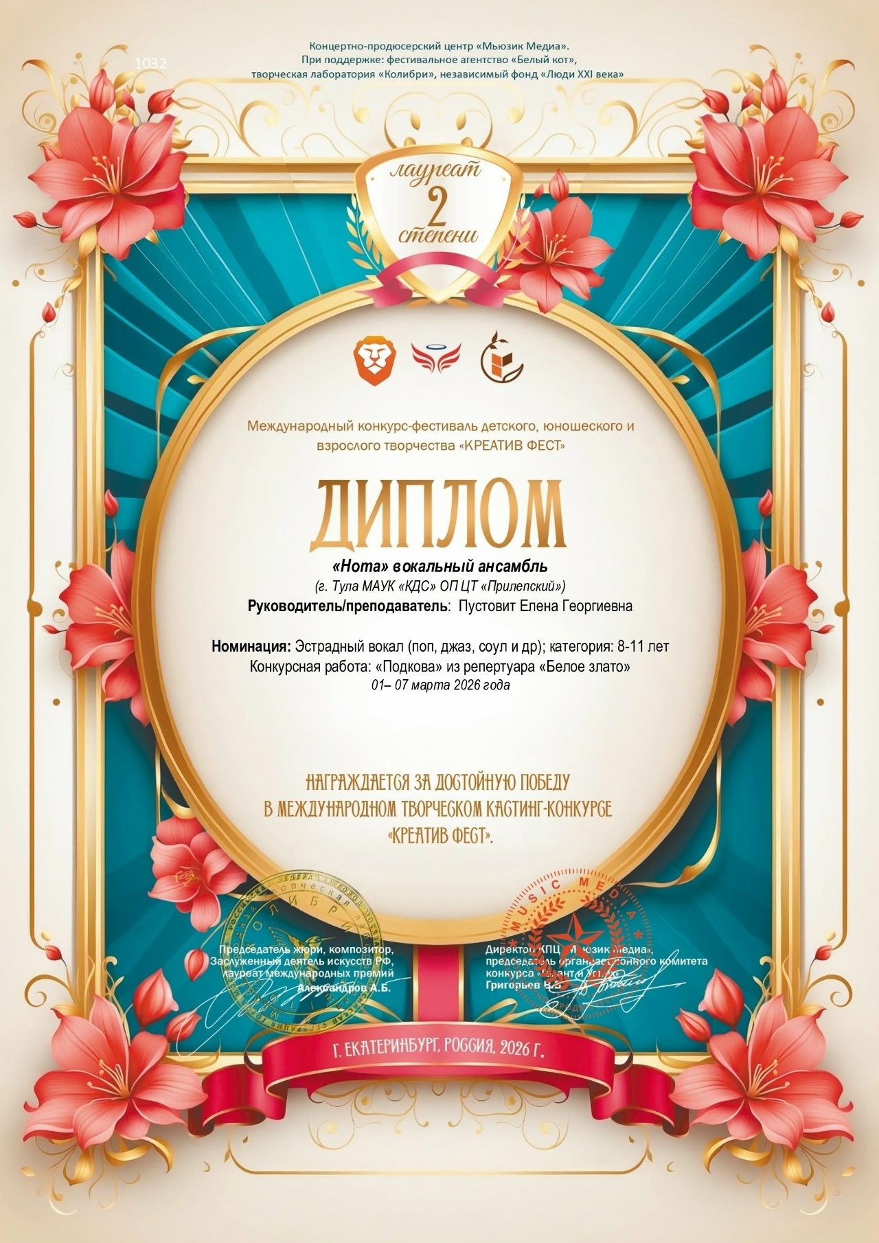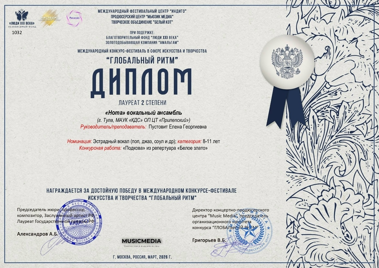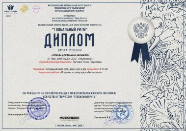 Вокальный ансамбль “Нота” получил звание Лауреата II степени на Международном конкурсе-фестивале в сфере искусства и творчества “Глобальный ритм” и на Международном конкурсе-фестивале детского, юношеского и взрослого творчества “Креатив Фест”.