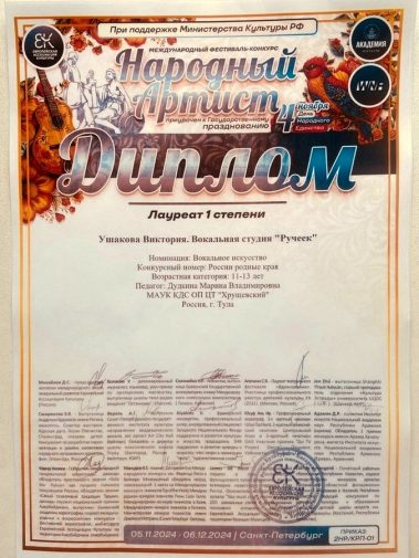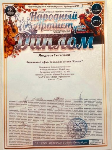 Воспитанники вокальной студии “Ручеек” – рук. Дудкина М.В. ( Центр творчества “ХРУЩЕВСКИЙ”) приняли участие в конкурсе-фестивале “Народный артист” при поддержке Министерства Культуры РФ, приурочен к государственному празднованию Дню Народного Единства.