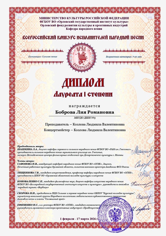 Поздравляем с успешным выступлением на Всероссийском конкурсе исполнителей народной песни “Орёл сизокрылый” учащуюся Детской школы искусств № 5 Боброву Лию, класс преподавателя Козловой Л.В. – лауреат I степени.