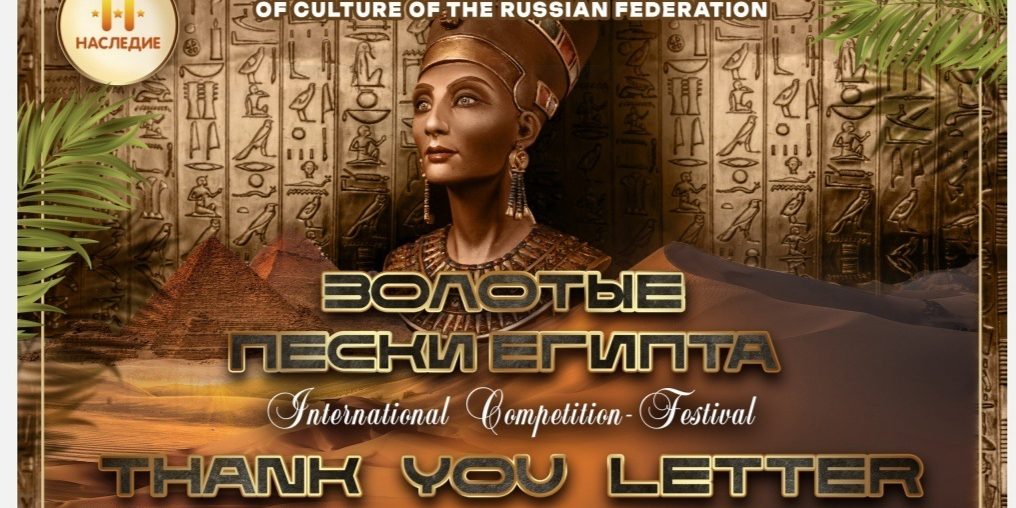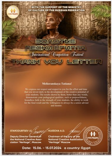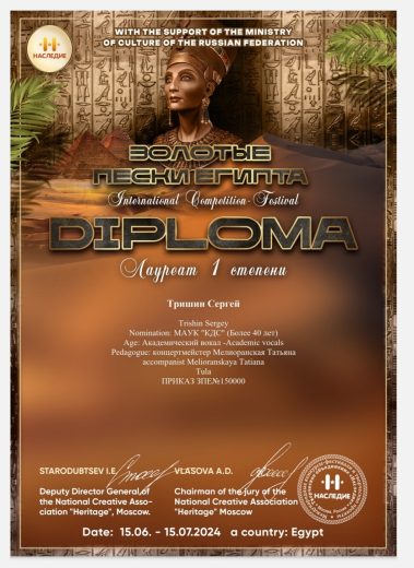 Поздравляем Тришина Сергея с присвоением Лауреата 1 степени в конкурсе “Золотые пески Египта”, Благодарность выражается концертмейстеру Мелиоранской Татьяне Николаевне